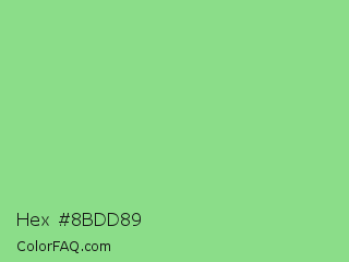 Hex #8bdd89 Color is a light green color and the nearest color is Light Green #90ee90. Hex code #8bdd89 and RGB value is rgb(139,221,137). In RGB color space, this color is composed of 55% red, 87% green, 54% blue, In CMYK color space, this color is composed of 37% cyan, 0% magenta, 38% yellow , 13% black , In HSL color space, this color has a hue angle of 119° , 55% saturation and 70% lightness.