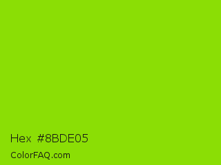 Hex #8bde05 Color is a normal green color and the nearest color is Alien Armpit #84de02. Hex code #8bde05 and RGB value is rgb(139,222,5). In RGB color space, this color is composed of 55% red, 87% green, 2% blue, In CMYK color space, this color is composed of 37% cyan, 0% magenta, 98% yellow , 13% black , In HSL color space, this color has a hue angle of 83° , 96% saturation and 45% lightness.