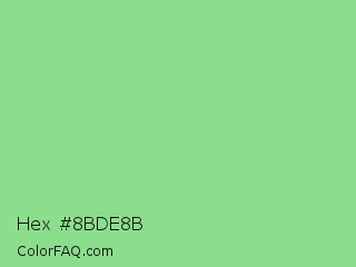 Hex #8bde8b Color is a light green color and the nearest color is Light Green #90ee90. Hex code #8bde8b and RGB value is rgb(139,222,139). In RGB color space, this color is composed of 55% red, 87% green, 55% blue, In CMYK color space, this color is composed of 37% cyan, 0% magenta, 37% yellow , 13% black , In HSL color space, this color has a hue angle of 120° , 56% saturation and 71% lightness.