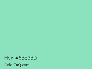 Hex #8be3bd Color is a light green color and the nearest color is Algae Green #93dfb8. Hex code #8be3bd and RGB value is rgb(139,227,189). In RGB color space, this color is composed of 55% red, 89% green, 74% blue, In CMYK color space, this color is composed of 39% cyan, 0% magenta, 17% yellow , 11% black , In HSL color space, this color has a hue angle of 154° , 61% saturation and 72% lightness.