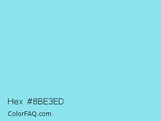 Hex #8be3ed Color is a light cyan color and the nearest color is Medium Sky Blue #80daeb. Hex code #8be3ed and RGB value is rgb(139,227,237). In RGB color space, this color is composed of 55% red, 89% green, 93% blue, In CMYK color space, this color is composed of 41% cyan, 4% magenta, 0% yellow , 7% black , In HSL color space, this color has a hue angle of 186° , 73% saturation and 74% lightness.