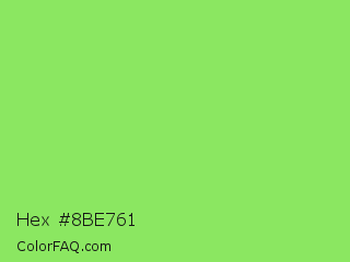 Hex #8be761 Color is a light green color and the nearest color is Pastel Green #77dd77. Hex code #8be761 and RGB value is rgb(139,231,97). In RGB color space, this color is composed of 55% red, 91% green, 38% blue, In CMYK color space, this color is composed of 40% cyan, 0% magenta, 58% yellow , 9% black , In HSL color space, this color has a hue angle of 101° , 74% saturation and 64% lightness.