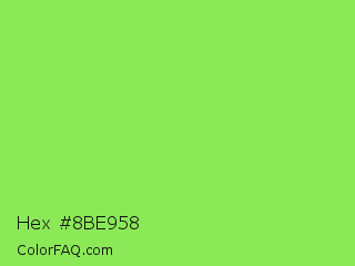 Hex #8be958 Color is a light green color and the nearest color is Kiwi #8ee53f. Hex code #8be958 and RGB value is rgb(139,233,88). In RGB color space, this color is composed of 55% red, 91% green, 35% blue, In CMYK color space, this color is composed of 40% cyan, 0% magenta, 62% yellow , 9% black , In HSL color space, this color has a hue angle of 99° , 77% saturation and 63% lightness.