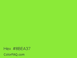 Hex #8bea37 Color is a normal green color and the nearest color is Kiwi #8ee53f. Hex code #8bea37 and RGB value is rgb(139,234,55). In RGB color space, this color is composed of 55% red, 92% green, 22% blue, In CMYK color space, this color is composed of 41% cyan, 0% magenta, 76% yellow , 8% black , In HSL color space, this color has a hue angle of 92° , 81% saturation and 57% lightness.