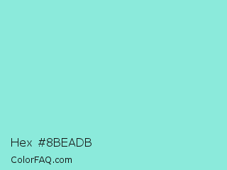 Hex #8beadb Color is a light cyan color and the nearest color is Riptide #8be6d8. Hex code #8beadb and RGB value is rgb(139,234,219). In RGB color space, this color is composed of 55% red, 92% green, 86% blue, In CMYK color space, this color is composed of 41% cyan, 0% magenta, 6% yellow , 8% black , In HSL color space, this color has a hue angle of 171° , 69% saturation and 73% lightness.
