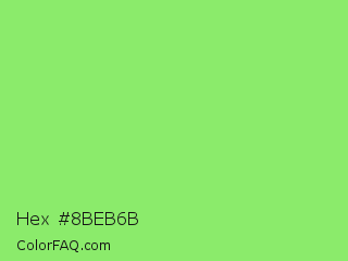 Hex #8beb6b Color is a light green color and the nearest color is Pastel Green #77dd77. Hex code #8beb6b and RGB value is rgb(139,235,107). In RGB color space, this color is composed of 55% red, 92% green, 42% blue, In CMYK color space, this color is composed of 41% cyan, 0% magenta, 54% yellow , 8% black , In HSL color space, this color has a hue angle of 105° , 76% saturation and 67% lightness.