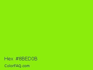 Hex #8bed0b Color is a normal green color and the nearest color is Alien Armpit #84de02. Hex code #8bed0b and RGB value is rgb(139,237,11). In RGB color space, this color is composed of 55% red, 93% green, 4% blue, In CMYK color space, this color is composed of 41% cyan, 0% magenta, 95% yellow , 7% black , In HSL color space, this color has a hue angle of 86° , 91% saturation and 49% lightness.