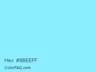 Hex #8beeff Color is a light cyan color and the nearest color is Electric Blue #7df9ff. Hex code #8beeff and RGB value is rgb(139,238,255). In RGB color space, this color is composed of 55% red, 93% green, 100% blue, In CMYK color space, this color is composed of 45% cyan, 7% magenta, 0% yellow , 0% black , In HSL color space, this color has a hue angle of 189° , 100% saturation and 77% lightness.