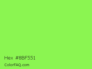 Hex #8bf551 Color is a light green color and the nearest color is Kiwi #8ee53f. Hex code #8bf551 and RGB value is rgb(139,245,81). In RGB color space, this color is composed of 55% red, 96% green, 32% blue, In CMYK color space, this color is composed of 43% cyan, 0% magenta, 67% yellow , 4% black , In HSL color space, this color has a hue angle of 99° , 89% saturation and 64% lightness.