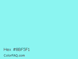 Hex #8bf5f1 Color is a light cyan color and the nearest color is Electric Blue #7df9ff. Hex code #8bf5f1 and RGB value is rgb(139,245,241). In RGB color space, this color is composed of 55% red, 96% green, 95% blue, In CMYK color space, this color is composed of 43% cyan, 0% magenta, 2% yellow , 4% black , In HSL color space, this color has a hue angle of 178° , 84% saturation and 75% lightness.