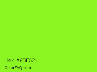 Hex #8bf621 Color is a normal green color and the nearest color is Spring Frost #87ff2a. Hex code #8bf621 and RGB value is rgb(139,246,33). In RGB color space, this color is composed of 55% red, 96% green, 13% blue, In CMYK color space, this color is composed of 43% cyan, 0% magenta, 87% yellow , 4% black , In HSL color space, this color has a hue angle of 90° , 92% saturation and 55% lightness.