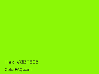 Hex #8bf806 Color is a normal green color and the nearest color is Chartreuse #7fff00. Hex code #8bf806 and RGB value is rgb(139,248,6). In RGB color space, this color is composed of 55% red, 97% green, 2% blue, In CMYK color space, this color is composed of 44% cyan, 0% magenta, 98% yellow , 3% black , In HSL color space, this color has a hue angle of 87° , 95% saturation and 50% lightness.