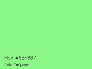 Hex #8bf887 Color is a light green color and the nearest color is Light Green #90ee90. Hex code #8bf887 and RGB value is rgb(139,248,135). In RGB color space, this color is composed of 55% red, 97% green, 53% blue, In CMYK color space, this color is composed of 44% cyan, 0% magenta, 46% yellow , 3% black , In HSL color space, this color has a hue angle of 118° , 89% saturation and 75% lightness.