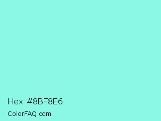 Hex #8bf8e6 Color is a light cyan color and the nearest color is Aquamarine #7fffd4. Hex code #8bf8e6 and RGB value is rgb(139,248,230). In RGB color space, this color is composed of 55% red, 97% green, 90% blue, In CMYK color space, this color is composed of 44% cyan, 0% magenta, 7% yellow , 3% black , In HSL color space, this color has a hue angle of 170° , 89% saturation and 76% lightness.