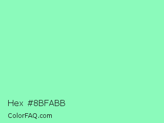 Hex #8bfabb Color is a light green color and the nearest color is Teal Deer #99e6b3. Hex code #8bfabb and RGB value is rgb(139,250,187). In RGB color space, this color is composed of 55% red, 98% green, 73% blue, In CMYK color space, this color is composed of 44% cyan, 0% magenta, 25% yellow , 2% black , In HSL color space, this color has a hue angle of 146° , 92% saturation and 76% lightness.