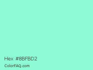Hex #8bfbd2 Color is a light green color and the nearest color is Aquamarine #7fffd4. Hex code #8bfbd2 and RGB value is rgb(139,251,210). In RGB color space, this color is composed of 55% red, 98% green, 82% blue, In CMYK color space, this color is composed of 45% cyan, 0% magenta, 16% yellow , 2% black , In HSL color space, this color has a hue angle of 158° , 93% saturation and 76% lightness.