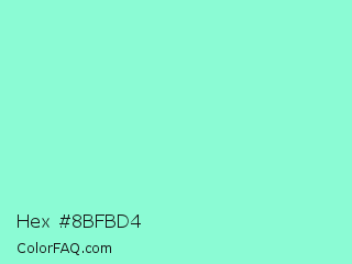 Hex #8bfbd4 Color is a light green color and the nearest color is Aquamarine #7fffd4. Hex code #8bfbd4 and RGB value is rgb(139,251,212). In RGB color space, this color is composed of 55% red, 98% green, 83% blue, In CMYK color space, this color is composed of 45% cyan, 0% magenta, 16% yellow , 2% black , In HSL color space, this color has a hue angle of 159° , 93% saturation and 76% lightness.