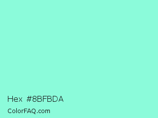Hex #8bfbda Color is a light green color and the nearest color is Aquamarine #7fffd4. Hex code #8bfbda and RGB value is rgb(139,251,218). In RGB color space, this color is composed of 55% red, 98% green, 85% blue, In CMYK color space, this color is composed of 45% cyan, 0% magenta, 13% yellow , 2% black , In HSL color space, this color has a hue angle of 162° , 93% saturation and 76% lightness.