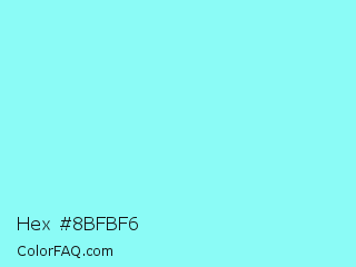 Hex #8bfbf6 Color is a light cyan color and the nearest color is Electric Blue #7df9ff. Hex code #8bfbf6 and RGB value is rgb(139,251,246). In RGB color space, this color is composed of 55% red, 98% green, 96% blue, In CMYK color space, this color is composed of 45% cyan, 0% magenta, 2% yellow , 2% black , In HSL color space, this color has a hue angle of 177° , 93% saturation and 76% lightness.