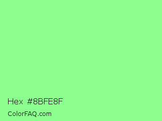 Hex #8bfe8f Color is a light green color and the nearest color is Mint Green #98ff98. Hex code #8bfe8f and RGB value is rgb(139,254,143). In RGB color space, this color is composed of 55% red, 100% green, 56% blue, In CMYK color space, this color is composed of 45% cyan, 0% magenta, 44% yellow , 0% black , In HSL color space, this color has a hue angle of 122° , 98% saturation and 77% lightness.
