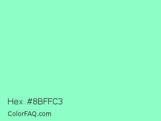 Hex #8bffc3 Color is a light green color and the nearest color is Aquamarine #7fffd4. Hex code #8bffc3 and RGB value is rgb(139,255,195). In RGB color space, this color is composed of 55% red, 100% green, 76% blue, In CMYK color space, this color is composed of 45% cyan, 0% magenta, 24% yellow , 0% black , In HSL color space, this color has a hue angle of 149° , 100% saturation and 77% lightness.