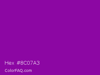 Hex #8c07a3 Color is a normal purple color and the nearest color is Violet RYB #8601af. Hex code #8c07a3 and RGB value is rgb(140,7,163). In RGB color space, this color is composed of 55% red, 3% green, 64% blue, In CMYK color space, this color is composed of 14% cyan, 96% magenta, 0% yellow , 36% black , In HSL color space, this color has a hue angle of 291° , 92% saturation and 33% lightness.
