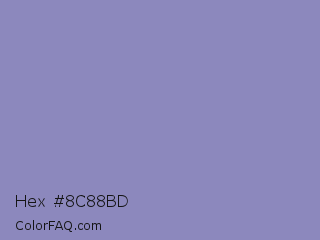 Hex #8c88bd Color is a light indigo color and the nearest color is Ube #8878c3. Hex code #8c88bd and RGB value is rgb(140,136,189). In RGB color space, this color is composed of 55% red, 53% green, 74% blue, In CMYK color space, this color is composed of 26% cyan, 28% magenta, 0% yellow , 26% black , In HSL color space, this color has a hue angle of 245° , 29% saturation and 64% lightness.