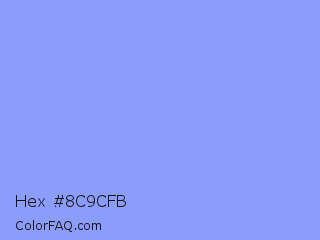 Hex #8c9cfb Color is a light blue color and the nearest color is Portage #8b9fee. Hex code #8c9cfb and RGB value is rgb(140,156,251). In RGB color space, this color is composed of 55% red, 61% green, 98% blue, In CMYK color space, this color is composed of 44% cyan, 38% magenta, 0% yellow , 2% black , In HSL color space, this color has a hue angle of 231° , 93% saturation and 77% lightness.