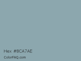Hex #8ca7ae Color is a light cyan color and the nearest color is Cadet Grey #91a3b0. Hex code #8ca7ae and RGB value is rgb(140,167,174). In RGB color space, this color is composed of 55% red, 65% green, 68% blue, In CMYK color space, this color is composed of 20% cyan, 4% magenta, 0% yellow , 32% black , In HSL color space, this color has a hue angle of 192° , 17% saturation and 62% lightness.