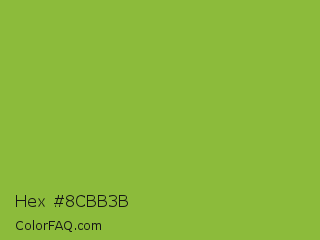 Hex #8cbb3b Color is a normal green color and the nearest color is Sushi #87ab39. Hex code #8cbb3b and RGB value is rgb(140,187,59). In RGB color space, this color is composed of 55% red, 73% green, 23% blue, In CMYK color space, this color is composed of 25% cyan, 0% magenta, 68% yellow , 27% black , In HSL color space, this color has a hue angle of 82° , 52% saturation and 48% lightness.
