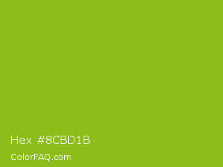 Hex #8cbd1b Color is a normal lime color and the nearest color is Lima #76bd17. Hex code #8cbd1b and RGB value is rgb(140,189,27). In RGB color space, this color is composed of 55% red, 74% green, 11% blue, In CMYK color space, this color is composed of 26% cyan, 0% magenta, 86% yellow , 26% black , In HSL color space, this color has a hue angle of 78° , 75% saturation and 42% lightness.
