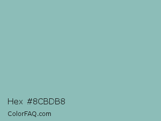 Hex #8cbdb8 Color is a light cyan color and the nearest color is Shadow Green #9ac2b8. Hex code #8cbdb8 and RGB value is rgb(140,189,184). In RGB color space, this color is composed of 55% red, 74% green, 72% blue, In CMYK color space, this color is composed of 26% cyan, 0% magenta, 3% yellow , 26% black , In HSL color space, this color has a hue angle of 174° , 27% saturation and 65% lightness.