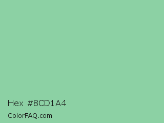 Hex #8cd1a4 Color is a light green color and the nearest color is Eton Blue #96c8a2. Hex code #8cd1a4 and RGB value is rgb(140,209,164). In RGB color space, this color is composed of 55% red, 82% green, 64% blue, In CMYK color space, this color is composed of 33% cyan, 0% magenta, 22% yellow , 18% black , In HSL color space, this color has a hue angle of 141° , 43% saturation and 68% lightness.