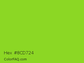 Hex #8cd724 Color is a normal green color and the nearest color is Atlantis #97cd2d. Hex code #8cd724 and RGB value is rgb(140,215,36). In RGB color space, this color is composed of 55% red, 84% green, 14% blue, In CMYK color space, this color is composed of 35% cyan, 0% magenta, 83% yellow , 16% black , In HSL color space, this color has a hue angle of 85° , 71% saturation and 49% lightness.