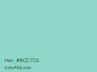 Hex #8cd7c6 Color is a light cyan color and the nearest color is Middle Blue Green #8dd9cc. Hex code #8cd7c6 and RGB value is rgb(140,215,198). In RGB color space, this color is composed of 55% red, 84% green, 78% blue, In CMYK color space, this color is composed of 35% cyan, 0% magenta, 8% yellow , 16% black , In HSL color space, this color has a hue angle of 166° , 48% saturation and 70% lightness.