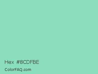 Hex #8cdfbe Color is a light green color and the nearest color is Pearl Aqua #88d8c0. Hex code #8cdfbe and RGB value is rgb(140,223,190). In RGB color space, this color is composed of 55% red, 87% green, 75% blue, In CMYK color space, this color is composed of 37% cyan, 0% magenta, 15% yellow , 13% black , In HSL color space, this color has a hue angle of 156° , 56% saturation and 71% lightness.