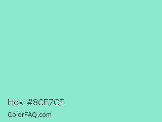 Hex #8ce7cf Color is a light cyan color and the nearest color is Riptide #8be6d8. Hex code #8ce7cf and RGB value is rgb(140,231,207). In RGB color space, this color is composed of 55% red, 91% green, 81% blue, In CMYK color space, this color is composed of 39% cyan, 0% magenta, 10% yellow , 9% black , In HSL color space, this color has a hue angle of 164° , 65% saturation and 73% lightness.