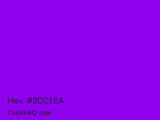 Hex #8d01ea Color is a normal purple color and the nearest color is Electric Violet #8b00ff. Hex code #8d01ea and RGB value is rgb(141,1,234). In RGB color space, this color is composed of 55% red, 0% green, 92% blue, In CMYK color space, this color is composed of 40% cyan, 100% magenta, 0% yellow , 8% black , In HSL color space, this color has a hue angle of 276° , 99% saturation and 46% lightness.