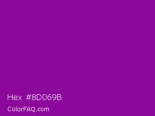 Hex #8d069b Color is a normal magenta color and the nearest color is Violet Eggplant #991199. Hex code #8d069b and RGB value is rgb(141,6,155). In RGB color space, this color is composed of 55% red, 2% green, 61% blue, In CMYK color space, this color is composed of 9% cyan, 96% magenta, 0% yellow , 39% black , In HSL color space, this color has a hue angle of 294° , 93% saturation and 32% lightness.