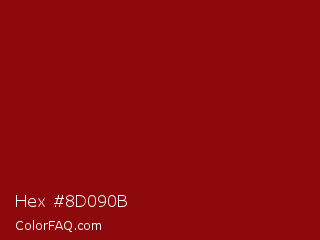 Hex #8d090b Color is a dark red color and the nearest color is Sangria #92000a. Hex code #8d090b and RGB value is rgb(141,9,11). In RGB color space, this color is composed of 55% red, 4% green, 4% blue, In CMYK color space, this color is composed of 0% cyan, 94% magenta, 92% yellow , 45% black , In HSL color space, this color has a hue angle of 359° , 88% saturation and 29% lightness.