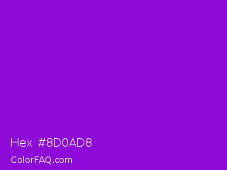 Hex #8d0ad8 Color is a normal purple color and the nearest color is French Violet #8806ce. Hex code #8d0ad8 and RGB value is rgb(141,10,216). In RGB color space, this color is composed of 55% red, 4% green, 85% blue, In CMYK color space, this color is composed of 35% cyan, 95% magenta, 0% yellow , 15% black , In HSL color space, this color has a hue angle of 278° , 91% saturation and 44% lightness.