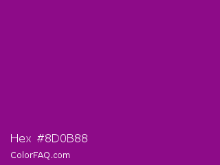 Hex #8d0b88 Color is a dark magenta color and the nearest color is Dark Magenta #8b008b. Hex code #8d0b88 and RGB value is rgb(141,11,136). In RGB color space, this color is composed of 55% red, 4% green, 53% blue, In CMYK color space, this color is composed of 0% cyan, 92% magenta, 4% yellow , 45% black , In HSL color space, this color has a hue angle of 302° , 86% saturation and 30% lightness.