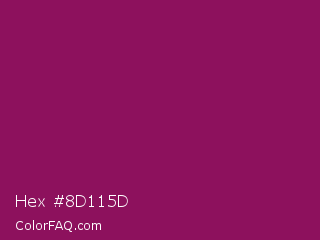 Hex #8d115d Color is a normal magenta color and the nearest color is Cardinal Pink #8c055e. Hex code #8d115d and RGB value is rgb(141,17,93). In RGB color space, this color is composed of 55% red, 7% green, 36% blue, In CMYK color space, this color is composed of 0% cyan, 88% magenta, 34% yellow , 45% black , In HSL color space, this color has a hue angle of 323° , 78% saturation and 31% lightness.