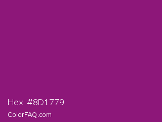 Hex #8d1779 Color is a normal magenta color and the nearest color is Mardi Gras #880085. Hex code #8d1779 and RGB value is rgb(141,23,121). In RGB color space, this color is composed of 55% red, 9% green, 47% blue, In CMYK color space, this color is composed of 0% cyan, 84% magenta, 14% yellow , 45% black , In HSL color space, this color has a hue angle of 310° , 72% saturation and 32% lightness.