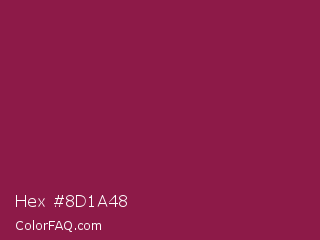 Hex #8d1a48 Color is a normal rose color and the nearest color is Disco #871550. Hex code #8d1a48 and RGB value is rgb(141,26,72). In RGB color space, this color is composed of 55% red, 10% green, 28% blue, In CMYK color space, this color is composed of 0% cyan, 82% magenta, 49% yellow , 45% black , In HSL color space, this color has a hue angle of 336° , 69% saturation and 33% lightness.