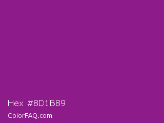 Hex #8d1b89 Color is a normal magenta color and the nearest color is Violet Eggplant #991199. Hex code #8d1b89 and RGB value is rgb(141,27,137). In RGB color space, this color is composed of 55% red, 11% green, 54% blue, In CMYK color space, this color is composed of 0% cyan, 81% magenta, 3% yellow , 45% black , In HSL color space, this color has a hue angle of 302° , 68% saturation and 33% lightness.
