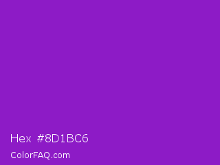 Hex #8d1bc6 Color is a normal purple color and the nearest color is French Violet #8806ce. Hex code #8d1bc6 and RGB value is rgb(141,27,198). In RGB color space, this color is composed of 55% red, 11% green, 78% blue, In CMYK color space, this color is composed of 29% cyan, 86% magenta, 0% yellow , 22% black , In HSL color space, this color has a hue angle of 280° , 76% saturation and 44% lightness.