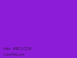 Hex #8d1cd8 Color is a normal purple color and the nearest color is Blue Violet #8a2be2. Hex code #8d1cd8 and RGB value is rgb(141,28,216). In RGB color space, this color is composed of 55% red, 11% green, 85% blue, In CMYK color space, this color is composed of 35% cyan, 87% magenta, 0% yellow , 15% black , In HSL color space, this color has a hue angle of 276° , 77% saturation and 48% lightness.