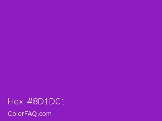 Hex #8d1dc1 Color is a normal purple color and the nearest color is Dark Orchid #9932cc. Hex code #8d1dc1 and RGB value is rgb(141,29,193). In RGB color space, this color is composed of 55% red, 11% green, 76% blue, In CMYK color space, this color is composed of 27% cyan, 85% magenta, 0% yellow , 24% black , In HSL color space, this color has a hue angle of 281° , 74% saturation and 44% lightness.