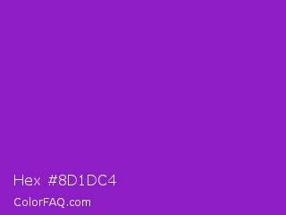 Hex #8d1dc4 Color is a normal purple color and the nearest color is Dark Orchid #9932cc. Hex code #8d1dc4 and RGB value is rgb(141,29,196). In RGB color space, this color is composed of 55% red, 11% green, 77% blue, In CMYK color space, this color is composed of 28% cyan, 85% magenta, 0% yellow , 23% black , In HSL color space, this color has a hue angle of 280° , 74% saturation and 44% lightness.